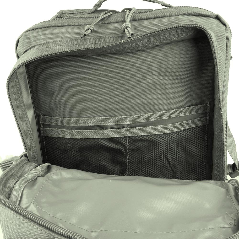 Большой штурмовой тактический рюкзак Mil-Tec зеленого цвета OD имеет объем около 36 литров. Он изготовлен из плотного полиэстера, а карманы на внутренней стороне отделаны винилом для защиты от влаги.