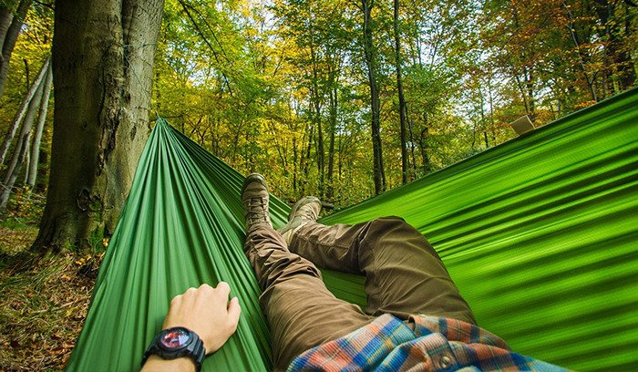 Универсальный гамак размером 300 x 150 см позволяет комфортно отдыхать людям ростом до 200 см. Гамак изготовлен из полиамидной ткани с переплетением рипстоп, которая обладает повышенной прочностью на разрыв. Ткань предварительно пропитана, что делает ее более устойчивой к росе и легким загрязнениям.