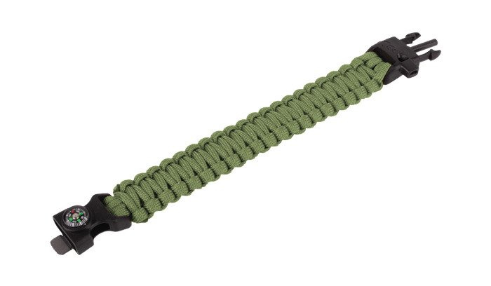 Браслет для выживания, основой которого является полимерная застежка-защелка, на концы которой намотан шнур паракорд. Шнур имеет сердечник из семи нейлоновых нитей, а застежка на кончике трезубца снабжена кремневым стержнем для натирания лезвия. Кроме того, в распоряжении пользователя остаются свисток, встроенный в пряжку, и компас с кнопкой.