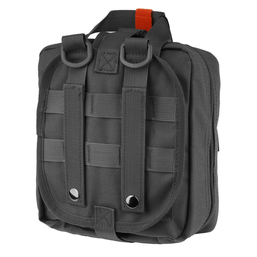 Удобство переноски кармана обеспечивается вшитой ручкой для транспортировки (с красной лентой Velcro), съемным плечевым ремнем и монтажной панелью, прикрепляемой к поясу или к тесьме MOLLE - благодаря панелям Velcro аптечку можно отсоединить одним движением и немедленно оказать помощь.