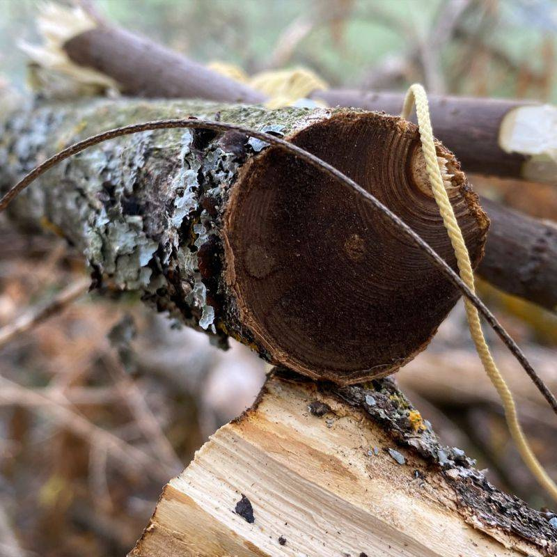 Струнная пила состоит из прочного кевларового шнура длиной 5 м, на каждом конце которого расположены металлические колеса, служащие ручками. Благодаря высокой прочности - до 120 кг - шнур справляется с распиловкой древесины и подобных материалов.