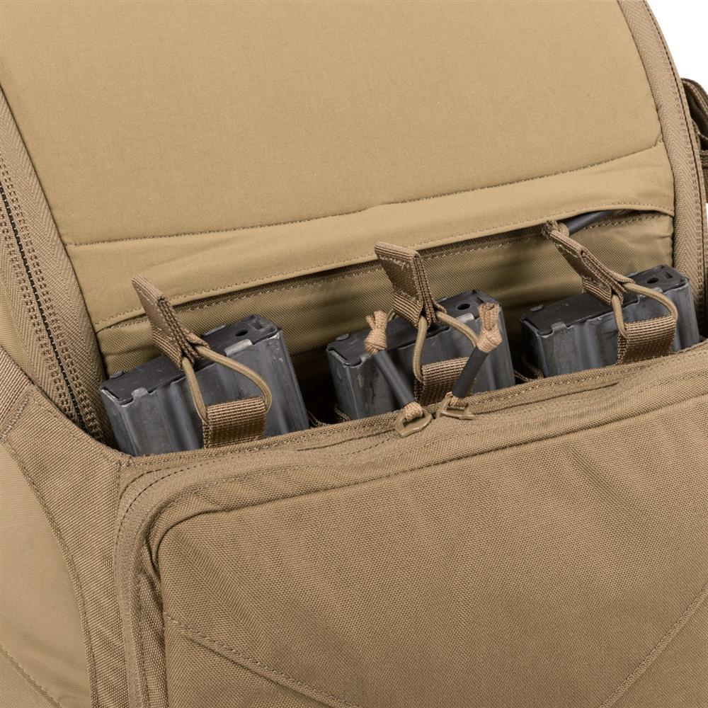 Благодаря съемному коврику, спрятанному в плоском внутреннем кармане, мы можем легко превратить рюкзак в аварийный карримат. В закрытом состоянии, с другой стороны, мы получаем доступ к эластичному карману и возможность установки специфического бобрового хвоста. Он оснащен встроенными подсумками для магазинов AR/AK, карманом для полноразмерного пистолета и карманом с велюровой подкладкой, совместимым с Versatile Insert System®. Благодаря ремням с пряжками его можно легко отсоединить от рюкзака и превратить в наплечную сумку.