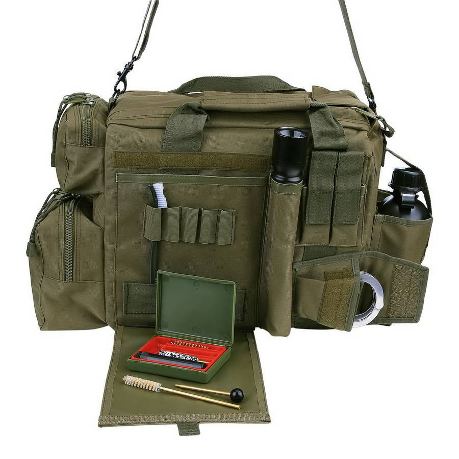 На задней внешней стенке имеется небольшой карман для наручников с застежкой-липучкой, два индивидуальных подсумка для пистолетных магазинов с застежкой-липучкой и органайзер, спрятанный под клапаном. Клапан закрывается на липучку, а под ним снаружи имеется плоский карман с эластичными ремнями, облегчающими переноску такого снаряжения, как мультитул, тактический фонарь или складной нож.