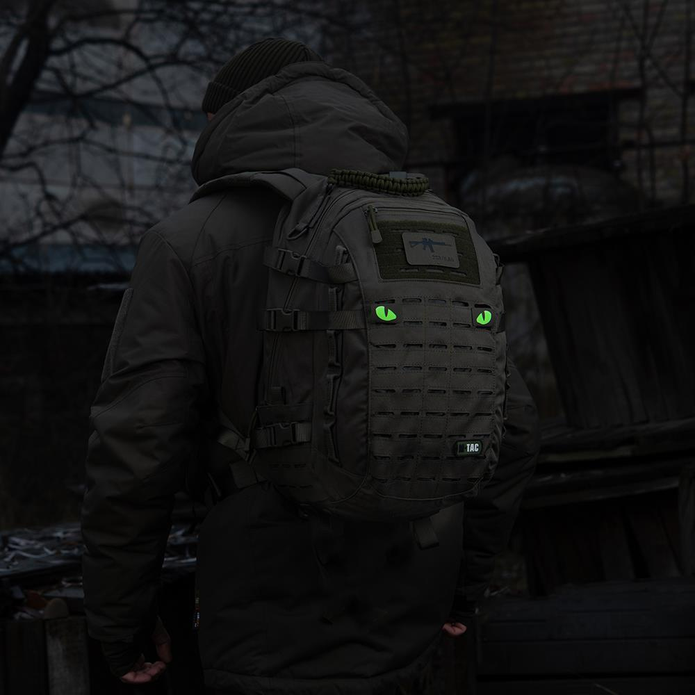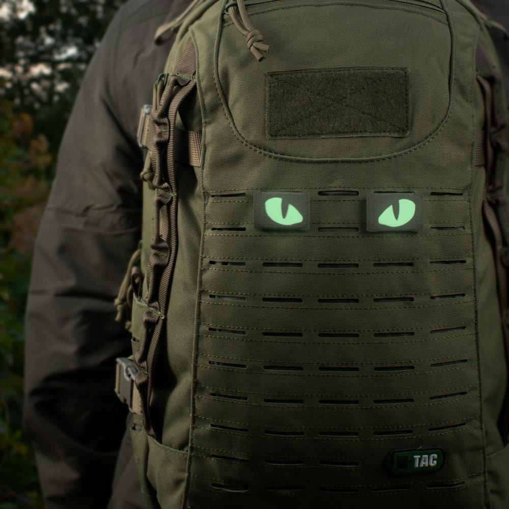 Тактические нашивки M-Tac Tiger Eyes предназначены для крепления к тесьме системы MOLLE вместо обычной липучки. Изображение выполнено из светящегося в темноте флуоресцентного материала.