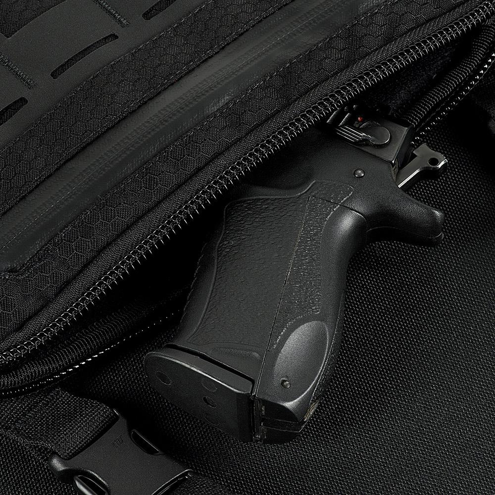 Край молнии переднего кармана обработан гидрофобным материалом, который уменьшает проникновение воды внутрь сумки. Кроме того, спереди имеется панель MOLLE/PALS, к которой можно прикрепить дополнительные универсальные карманы, повышающие общую практичность сумки. На сетчатой задней стенке расположен специальный карман для переноски смартфона или предмета аналогичного размера.