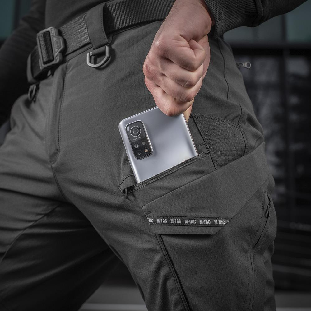 Равномерно распределенные карманы позволяют равномерно распределить снаряжение. Классические набедренные карманы с усиленными краями предназначены для ношения складного ножа или светодиодного фонарика. Наклонные грузовые карманы фиксируются клапаном на липучке и оснащены вертикальной молнией. Задние карманы на молнии подходят для ношения бумажника. На правом бедре над грузовым карманом производитель предусмотрел небольшой карман, предназначенный для мобильного телефона или небольшого блокнота.