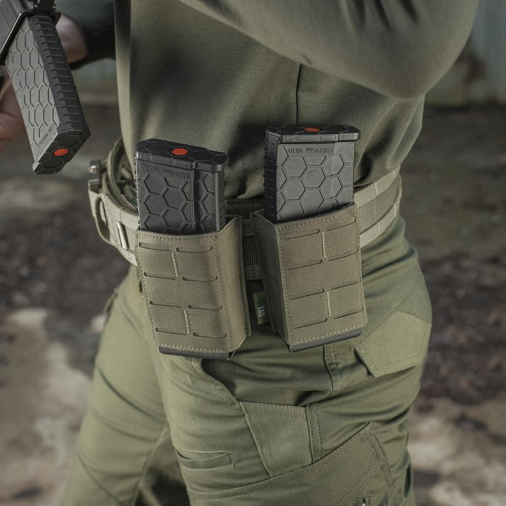 Подсумок изготовлен из прочной ткани Cordura®. Вмещает большинство стандартных магазинов для АК-47 / 74, M4 / M16, G36 и аналогичных винтовок. Крепится к боевому поясу или жилету с помощью двух совместимых с MOLLE монтажных ремней. Отсутствие защелок позволяет легко изменить конфигурацию подсумка в любое время, но при этом надежно фиксирует и удерживает магазины на месте. Позволяет легко переносить магазины на стрельбище и во время игр ASG.
