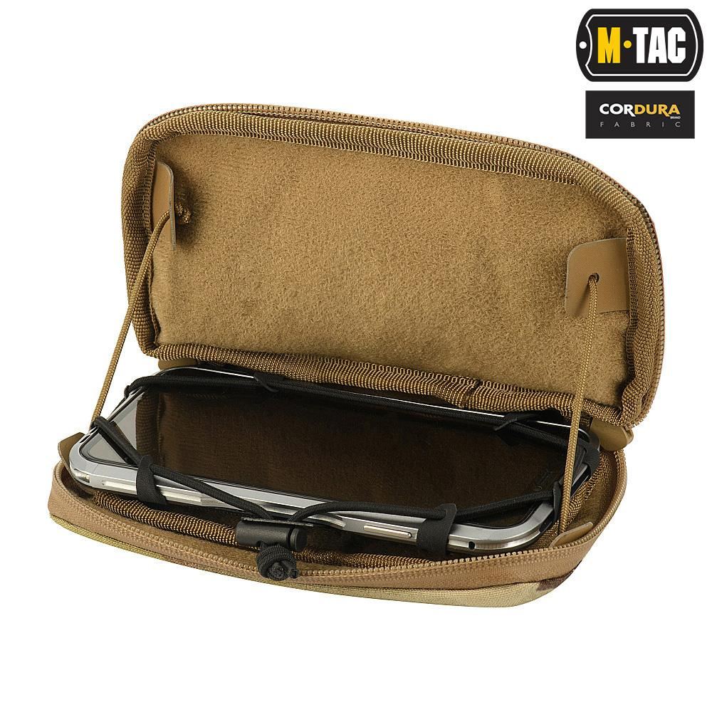 Внутри кармана находится универсальный держатель с эластичными лентами для крепления мобильного телефона. На передней части производитель разместил панель на липучке для крепления идентификационных или моральных нашивок. Все крепится с помощью крепежных ремней, совместимых с системой MOLLE / PALLS, совместимой с большинством тактических жилетов.