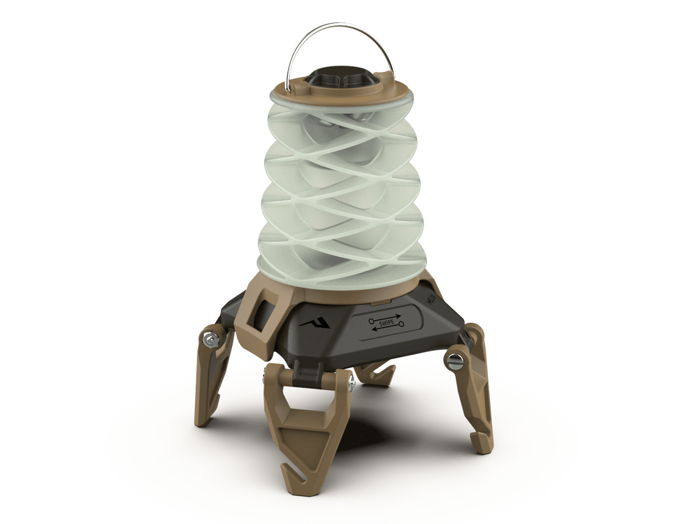 Он изготовлен из комбинации твердого пластика и гибкой резины. Раскладные ножки имеют специальные крючки для крепления на веревку или гвоздь. Складная головка позволяет легко переносить фонарь в кармане рюкзака или в бардачке автомобиля; в разложенном состоянии он рассеивает свет на 360°, поэтому хорошо освещает каждый уголок лагеря. Если снять абажур, лампа светит сфокусированным светом, идеально подходящим для освещения одной точки или конкретного участка.