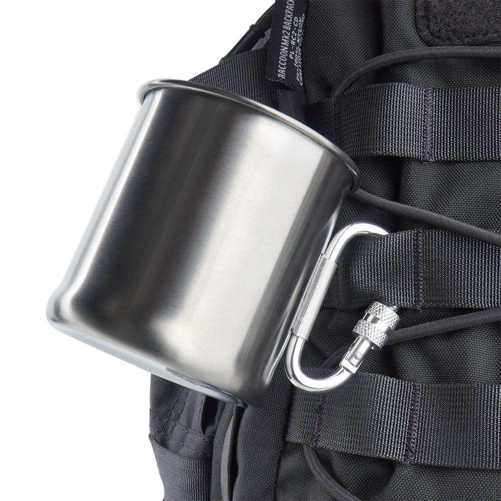 Кружка изготовлена из нержавеющей стали, имеет тонкие стенки и небольшой вес. Карабин закреплен металлической гайкой для предотвращения смещения. Это незаменимое дополнение к вашему походному зверинцу.
