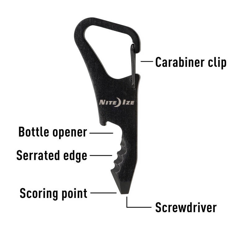 Он изготовлен из прочной стали и благодаря функции карабина может крепиться к петлям ремня тактических брюк. Кроме того, инструмент можно использовать в качестве плоской, крестовой отвертки и открывалки для бутылок. Кроме того, он оснащен небольшим зазубренным лезвием.