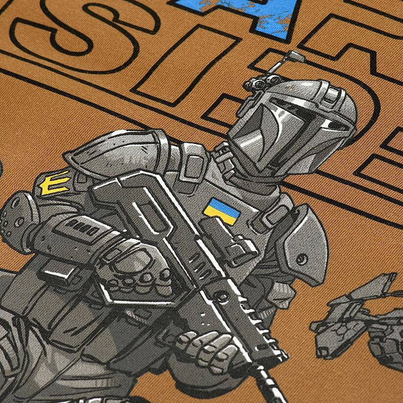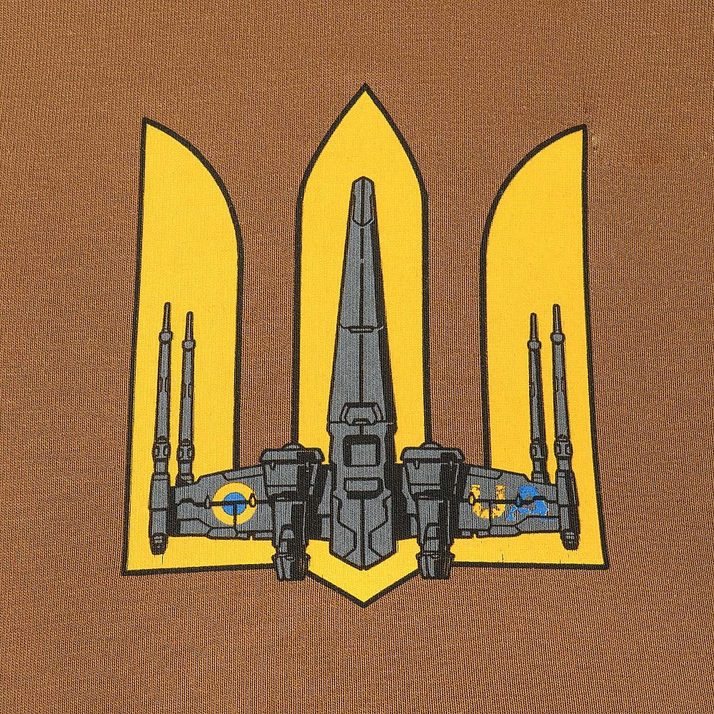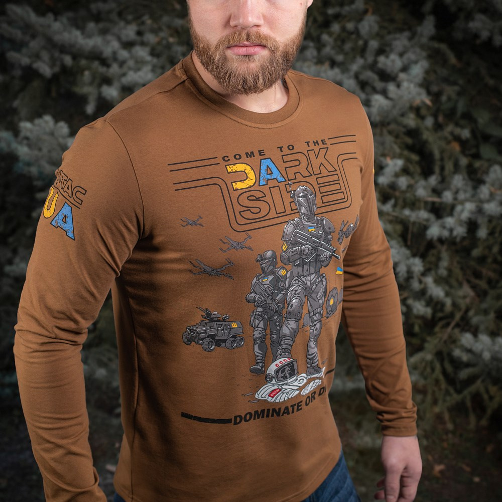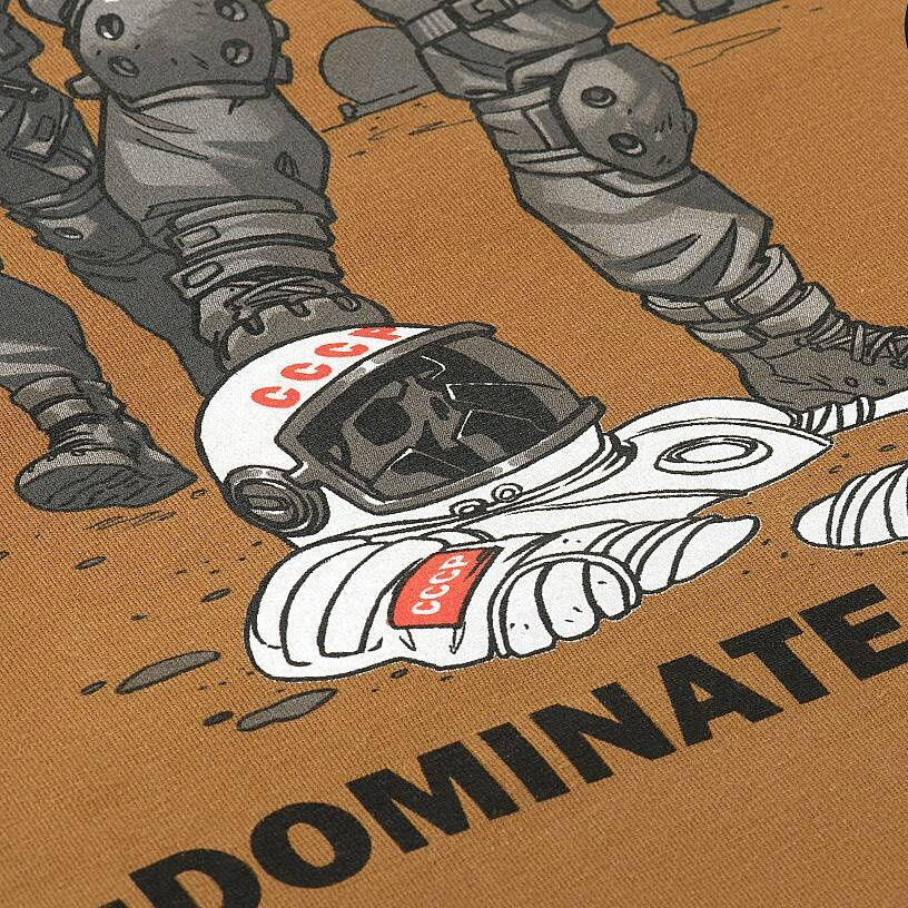 Толстовка украшена принтом на английском языке. Вверху - надпись "Come to the dark side", а внизу - надпись "Dominate or die" с оригинальным изображением украинских космонавтов с оружием в руках.