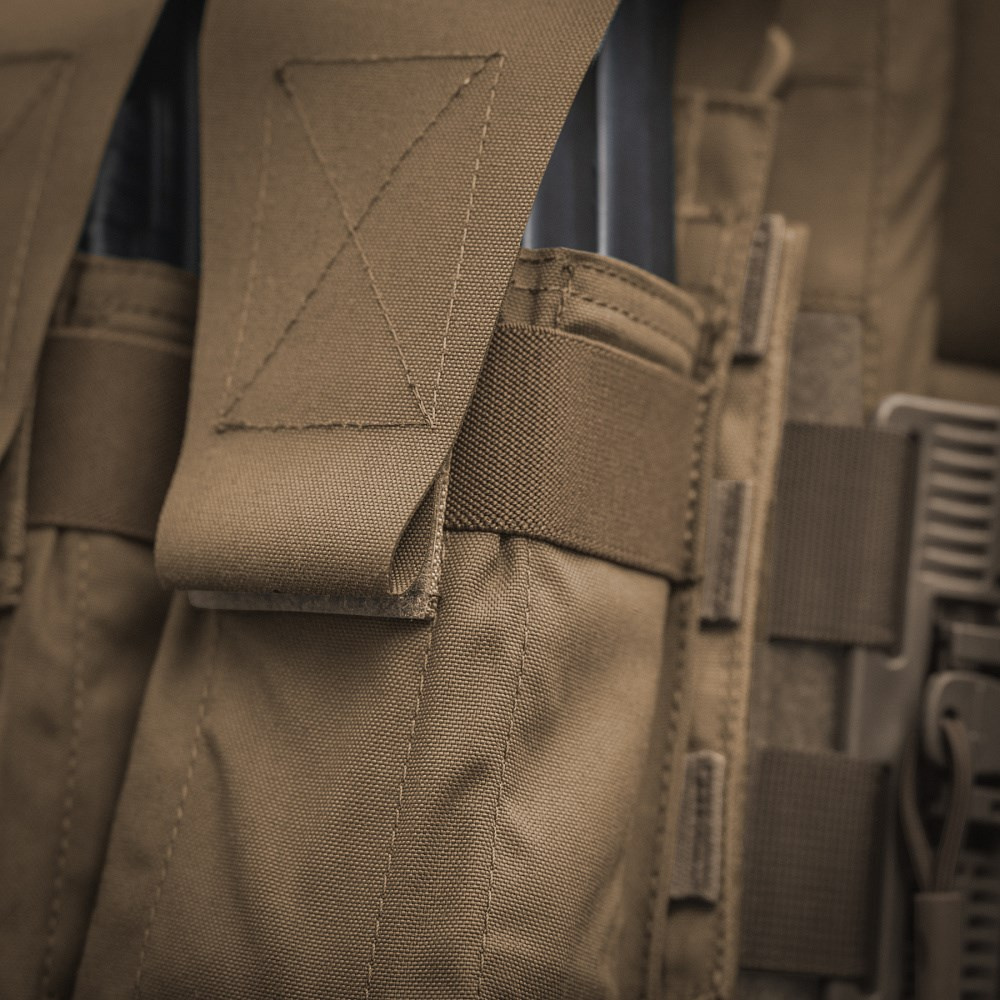 Имеет два независимых отделения, позволяющих хранить магазины длиной до 300 мм, закрывающиеся клапанами на липучках, что гарантирует надежное крепление магазинов. Кроме того, он оснащен панелью MOLLE, позволяющей закрепить его на тактическом ремне или другом снаряжении, совместимом с этой системой.
