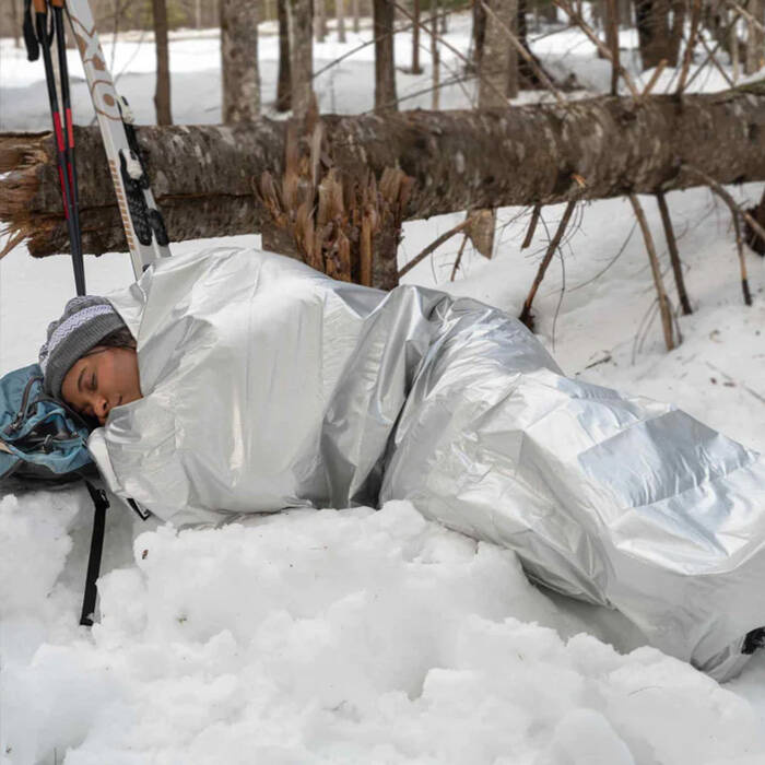 Спальный мешок-бивви марки SOL, характеризующийся теплоотражающей способностью 80%. Он изготовлен из материала, обладающего высокой механической прочностью, а также устойчивого к неблагоприятным погодным условиям. В нижней части имеется закрывающееся отверстие, обеспечивающее хорошую вентиляцию, что особенно важно при использовании в теплое время года. В опасных для жизни ситуациях веревка, составляющая застежку транспортного мешка, может быть использована в качестве стартера для разжигания огня, как и прикрепленный к ней аварийный свисток.