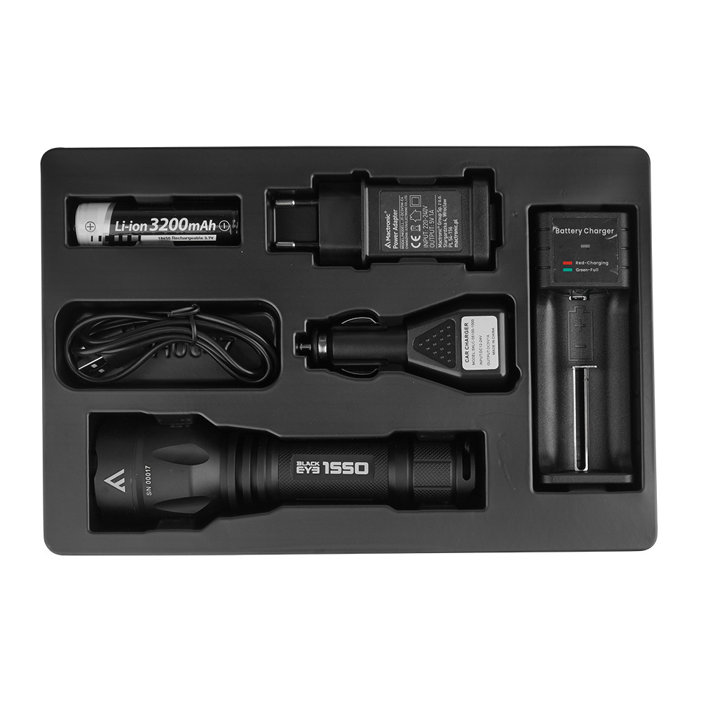Black Eye 1550, преемник Black Eye XM-L U2 LED MX142L-RC, - это высокоэффективный ручной фонарь Mactronic® с батарейным питанием. Эта модель имеет прочный алюминиевый корпус, устойчива к падениям (с высоты 1,5 м) и сертифицирована по стандарту IP65, что позволяет выдерживать самые жесткие условия работы. Фонарь очень универсален и может использоваться в качестве личного снаряжения или для других тактических и патрульных целей.