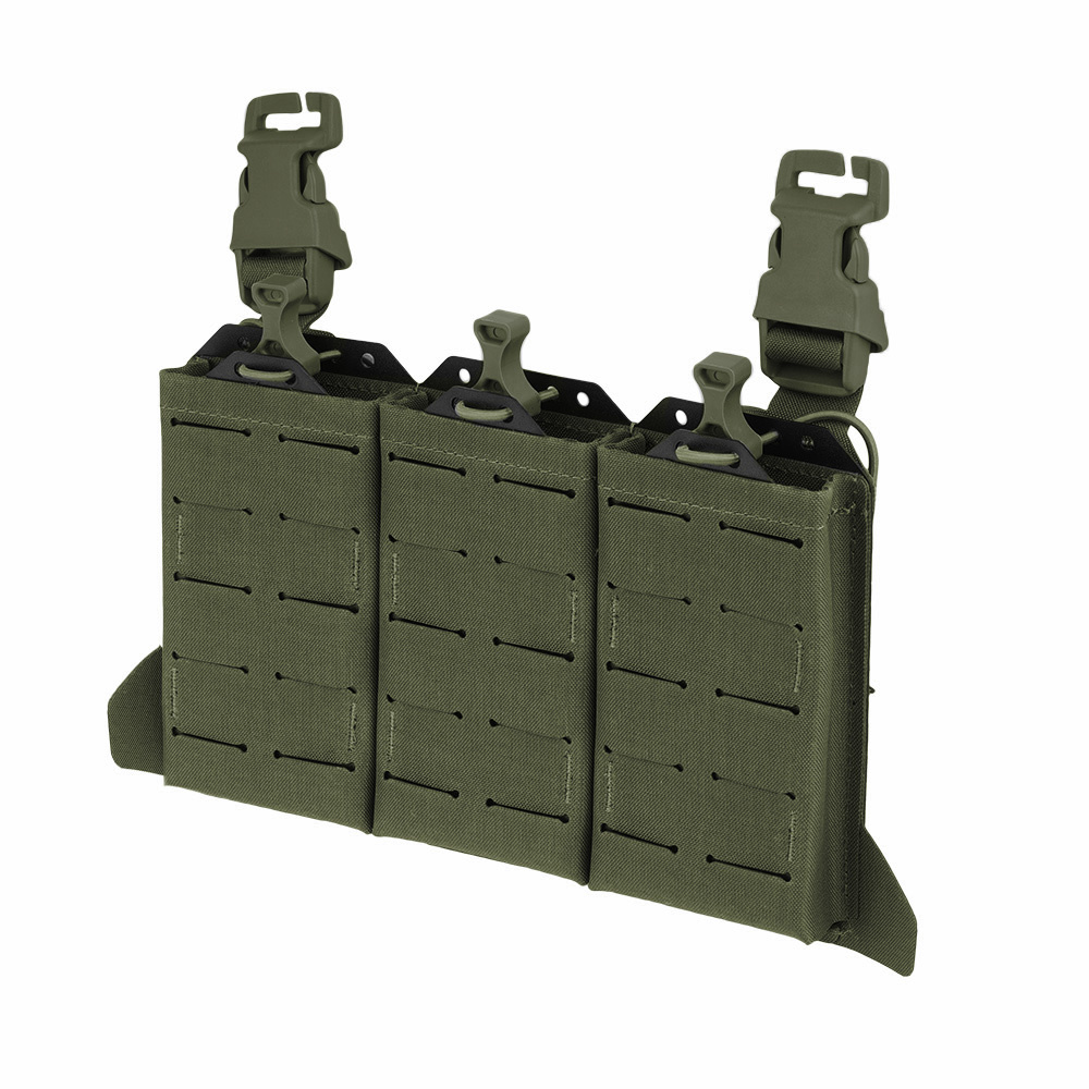 Передняя панель изготовлена из высококачественного ламината 500D Cordura, который гарантирует не только прочность, но и долговременную защиту от истирания и механических повреждений. Благодаря использованию эластичных съемников в каждом подсумке, магазины надежно удерживаются даже при интенсивном движении. Кроме того, пластиковые съемники позволяют быстро извлекать магазины, что очень удобно, особенно в боевых условиях или когда пользователь работает в перчатках.