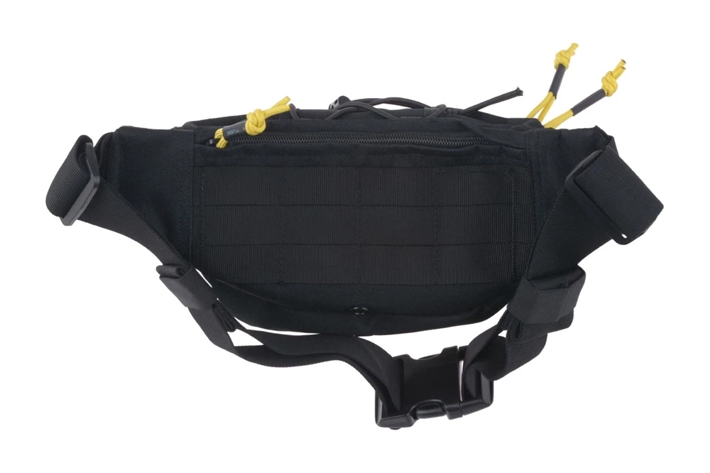В верхней части сумки находится шнур Shock-Cord, с помощью которого можно закрепить дополнительное снаряжение, например, бутылку или компактный дождевик. На задней стенке пришиты ленты системы крепления MOLLE/PALS, за которые мы можем прикрепить лайку, например, к рюкзаку или более крупной сумке. Сумка имеет ремень на липучке, который позволяет персонализировать ее, прикрепив нашивку с указанием принадлежности, содержимого или просто моральную нашивку.