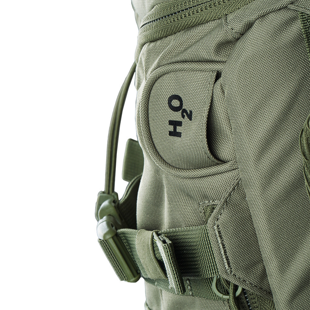 Удобные плечевые ремни анатомической формы регулируются по вертикали. Кроме того, практичности добавляют эластичный нагрудный ремень со встроенным свистком, петли для трубки системы гидратации, D-кольца и ремни для крепления аксессуаров. Внизу расположен съемный поясной ремень, закрывающийся составной пряжкой, также в системе MOLLE. Особенностью этого рюкзака является наличие внешнего отделения для переноски шлема.