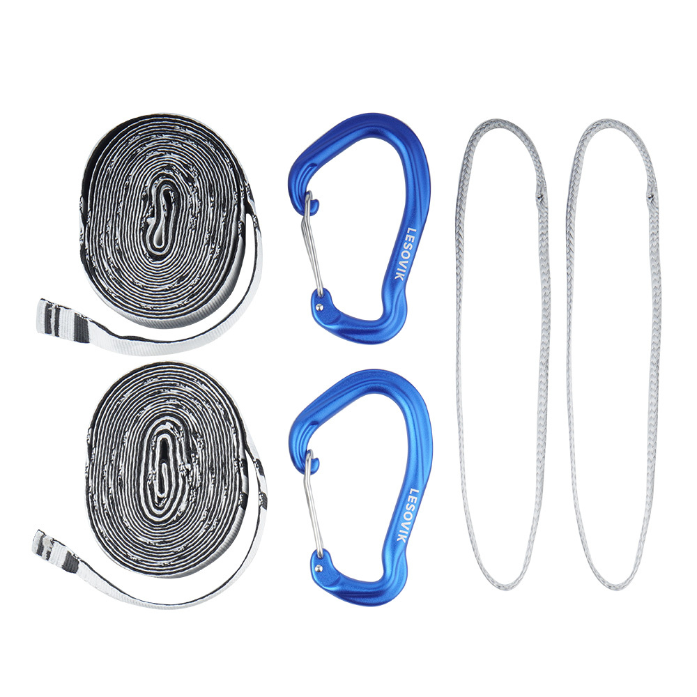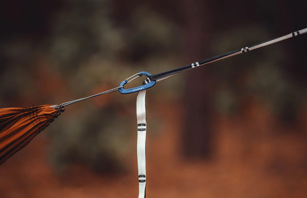 Комплект подвески SNEKA, включающий в себя тесьму, петли и защелкивающиеся крючки от Lesovik. Подвеска позволяет закрепить гамак интуитивно понятным способом, эффективно, без использования дополнительных узлов. Лески и тесьма изготовлены из ткани Dyneema, поэтому их прочность составляет 660 кг при допустимой нагрузке около 250 кг.