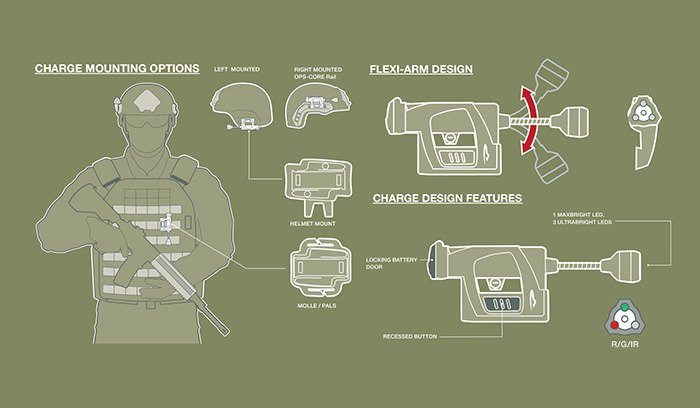 Комплект Charge Modular Personal Lighting System виготовлений відомою компанією Princeton Tec. Це надзвичайно функціональна та ефективна, але компактна освітлювальна система, призначена для встановлення на шоломах або бронежилетах за допомогою MOLLE/PALS-сумісних палетів.