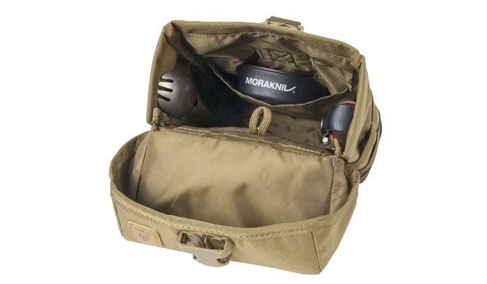 На тильній стороні сумки, під кріпленням, є відкрита зверху кишеня, яка закривається знизу на липучку Velco®. Це дозволяє зручно носити ніж, невелику сокиру або складну пилку. Всередині є панель з липучкою, за допомогою якої можна закріпити чохол.