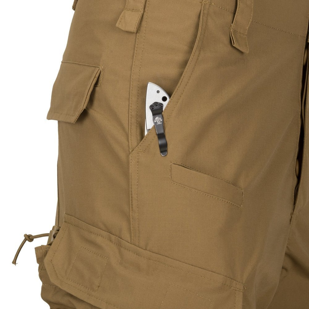 Конструкція включає десять кишень, розташованих на стегнах, стегнах, сідницях і литках, для розміщення обладнання, включаючи ніж, ліхтарик, мультитул або аптечку. Інші деталі, такі як петлі під ремінні петлі для карабінів або D-образні кільця, додають практичності при носінні. Вони будуть добре працювати в поєднанні з військовою курткою.
