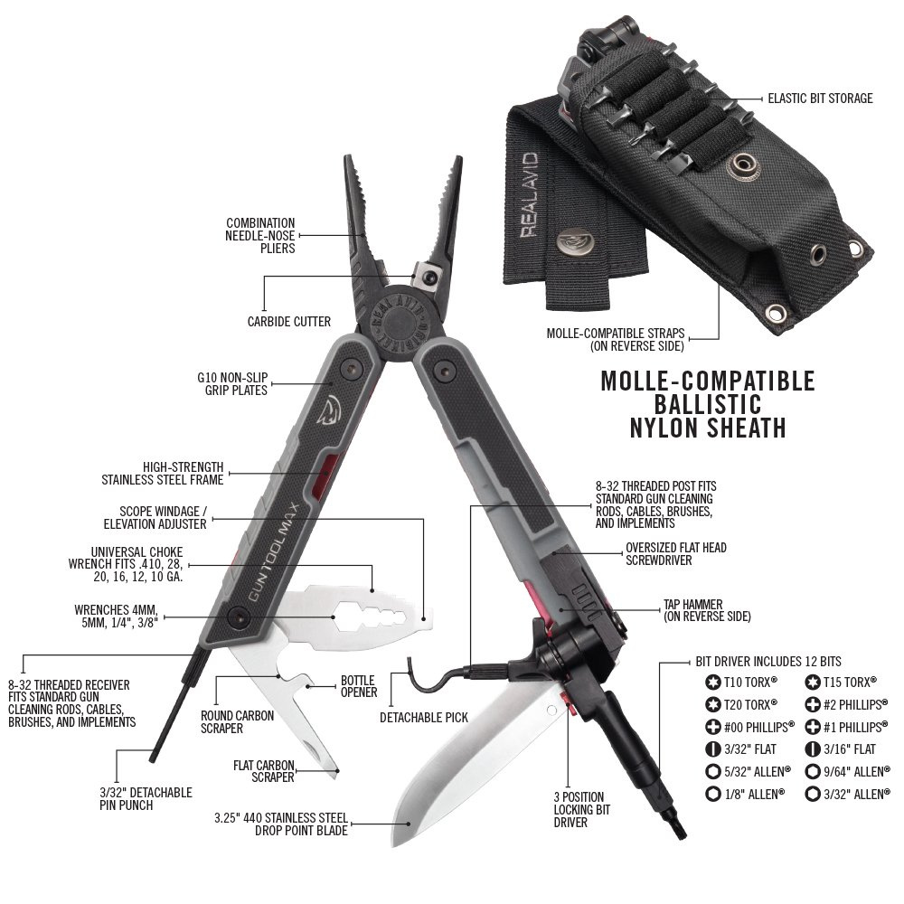 Gun Tool Max® - це багатофункціональний інструмент у вигляді мультитула, оснащений до 37 функціями, пристосованими до потреб користувачів вогнепальної зброї. Він включає в себе всі найнеобхідніші інструменти для обслуговування широкого спектру зброї - від пістолетів, револьверів, гвинтівок і карабінів до рушниць.