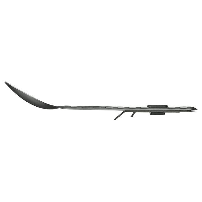 Він виготовлений з анодованого алюмінію, що робить його надзвичайно легким, але водночас міцним. Ручка виделки текстурована, завдяки чому вона надійно лежить в руці. На зворотному боці ручки є знімний мультитул, який також слугує ручкою і підставкою - у горизонтальному положенні він утримує виделку над землею, а також дозволяє зачепити її за край, наприклад, чашки або меніска.