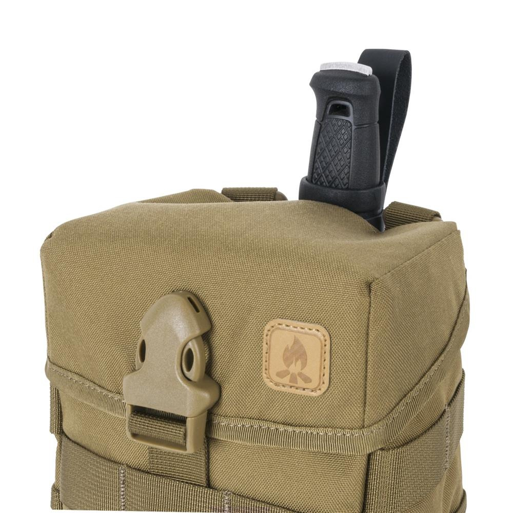 На тильній стороні сумки, під кріпленням, є відкрита зверху кишеня, яка закривається знизу на липучку Velco®. Це дозволяє зручно носити ніж, невелику сокиру або складну пилку. Всередині є панель з липучкою, за допомогою якої можна закріпити чохол.