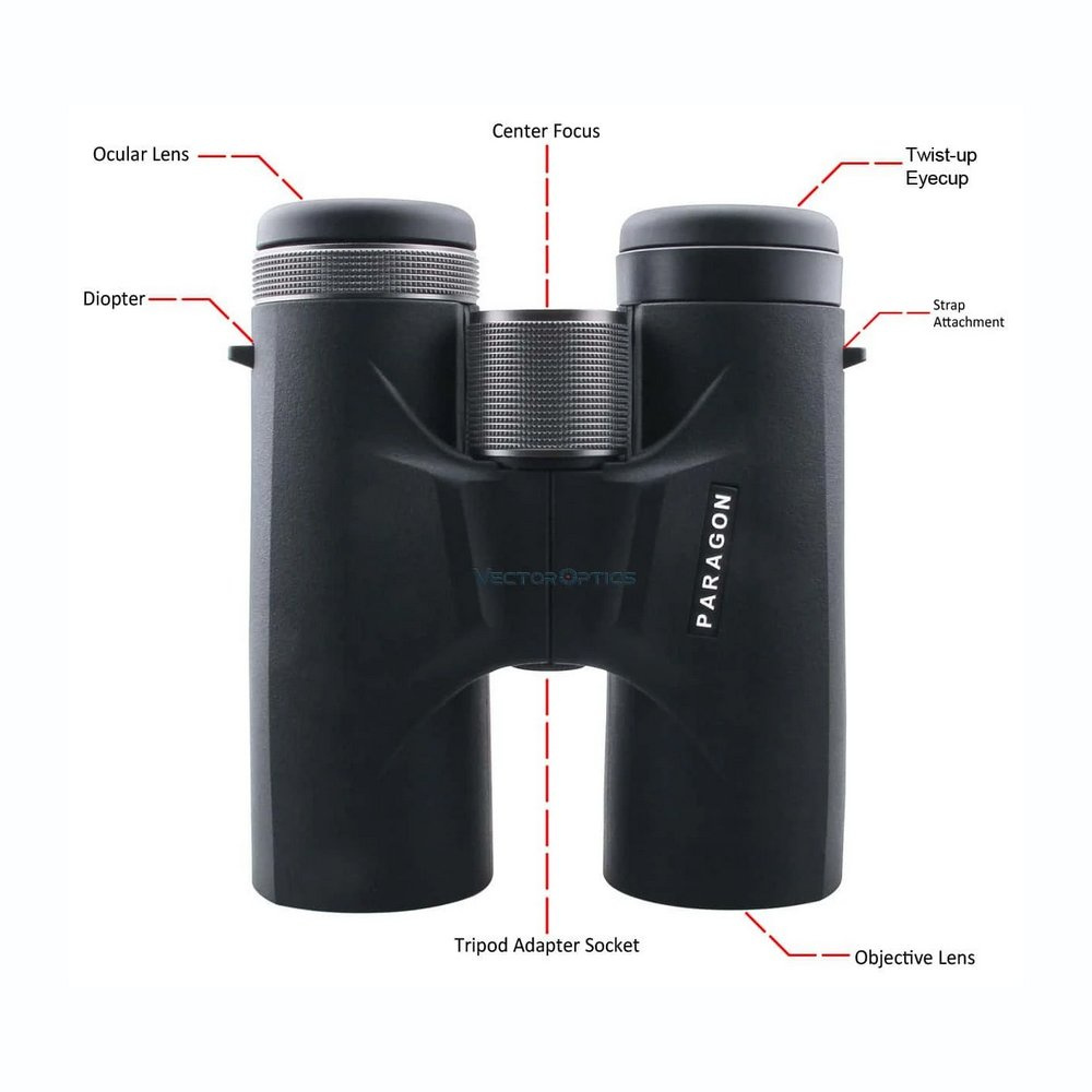 Мисливський бінокль Paragon оснащений діоптрійною корекцією і розташований в правому окулярі для компенсації відмінностей в зорі між правим і лівим оком. Конструкція бінокля оснащена кріпленням для шийного ременя, що запобігає випадковому вивільненню. Також має різьбу для кріплення на штатив.