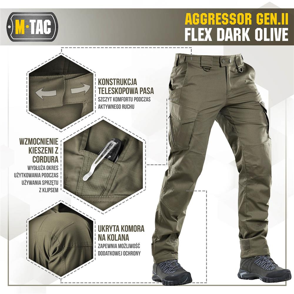 Тактичні штаниAggressor Gen.II Flex - функціональна та зручна модель від компанії M-Tac. Завдяки використанню еластичної та комфортної тканини, штани можуть з успіхом використовуватися як туристичний, мисливський або оперативний одяг. Місткі кишені в бойових штанах призначені для носіння спорядження EDC (Every Day Carry).