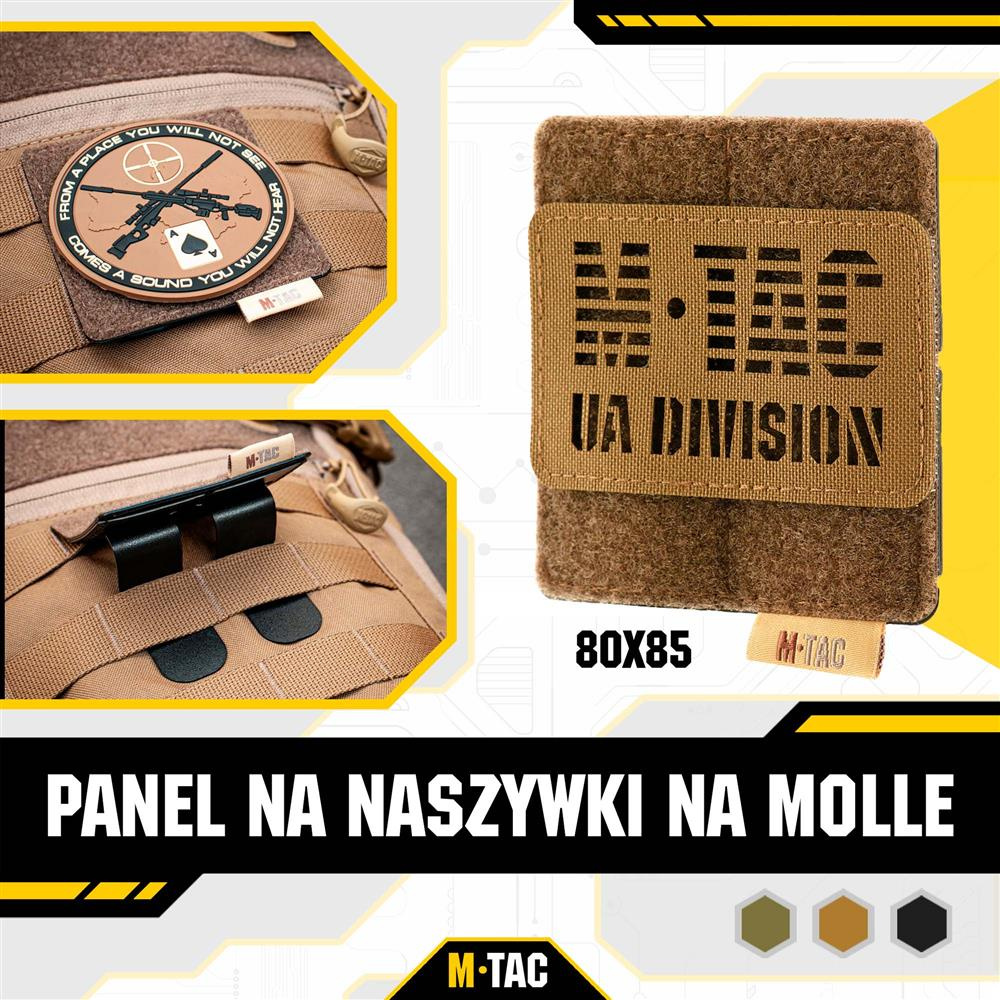 Панель Molle ідеально підходить як доповнення до рюкзака, на якому власник презентує свої цінності за допомогою нашивок і демонструє свій бойовий характер або чудове почуття гумору.