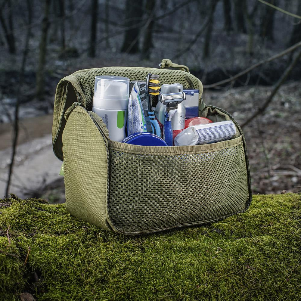 Легка та практична косметичка, виготовлена з поліестеру 600D. Її особливістю є внутрішня система організації. Практичні кишені та відділення допоможуть нам розмістити всілякі предмети гігієни, такі як зубна щітка або рушник. В одному з відділень можна знайти практичне дзеркальце. Після відкриття його можна повісити на пластиковий гачок.