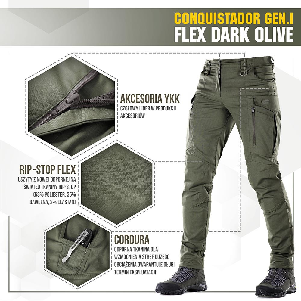 Військові штани Conquistador Gen.I Flex мають регулювання довжини поясу на липучках та застібку-блискавку від відомої компанії YKK. Петлі для ременів шириною 55 мм дозволяють використовувати більшість тактичних ременів, доступних на ринку. Завдяки тасьмі та липучкам на ногах, їх можна регулювати до двох висот відповідно до особистих уподобань користувача.