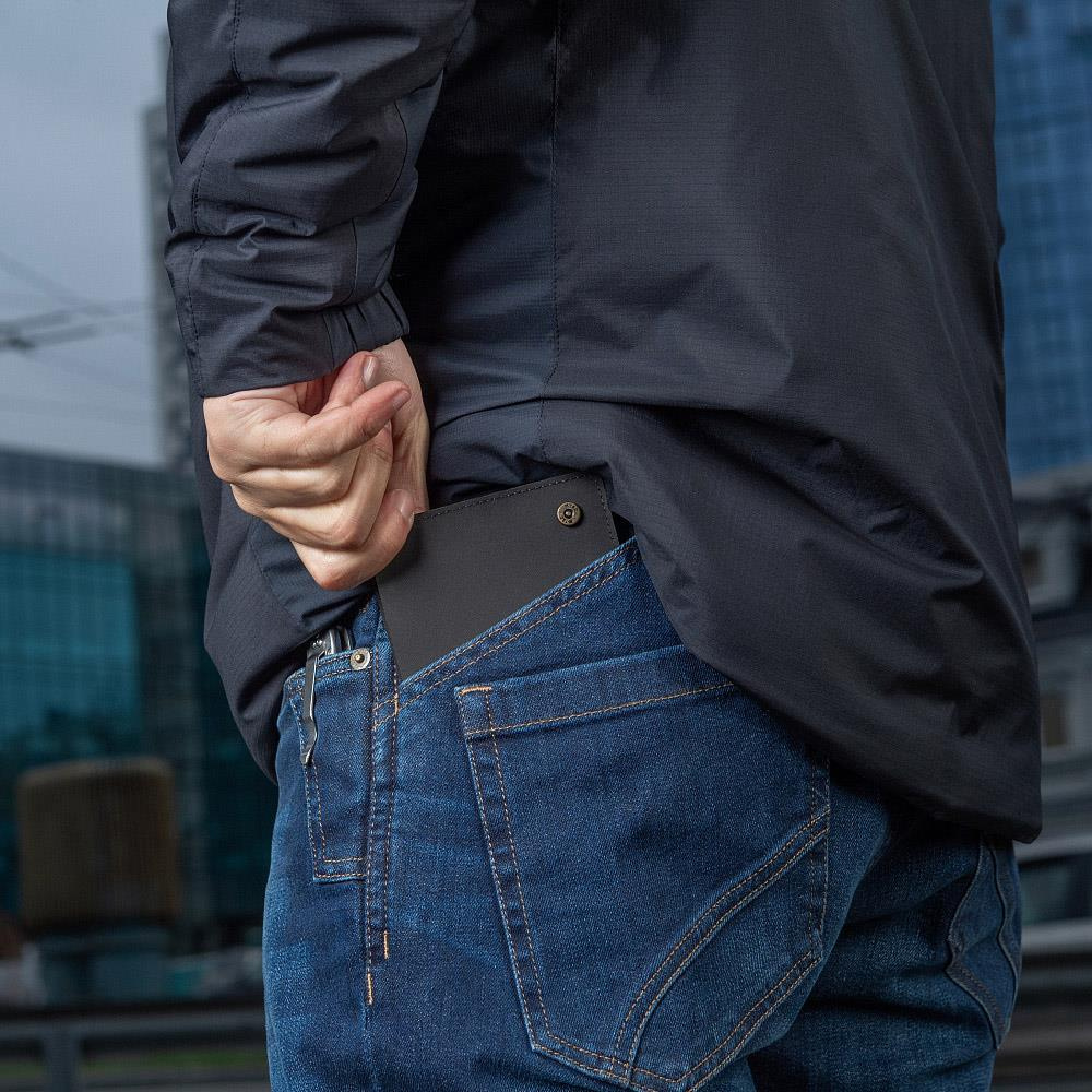 Гаманець M-Tac надзвичайно легкий і не заповнює кишені. Завдяки невеликому розміру він поміщається в кишеню сорочки або тактичних штанів. Є один на передній частині Латунна декоративна заклепка з підписом імені виробника. Slim Elite дозволяє транспортувати гроші та необхідні документи та підходить як гаманець EDC.