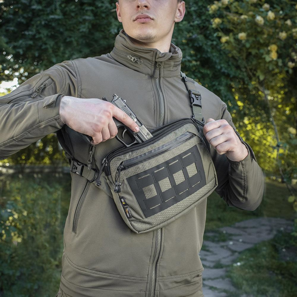 - Компактна сумка через плече, виготовлена з 500D Cordura та Hex Cordura