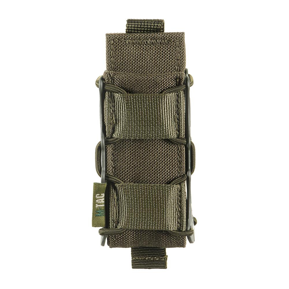 Універсальна однозарядка для пістолетів виробництва компанії M-Tac. Конструкція на основі еластичного шнура адаптується до форми магазину, надійно утримує його всередині та дозволяє легко вставляти та виймати. Кріпиться на розвантажувальні ремені системи MOLLE/PALS. Зовнішні кріпильні ремені дозволяють кріпити додаткове спорядження.