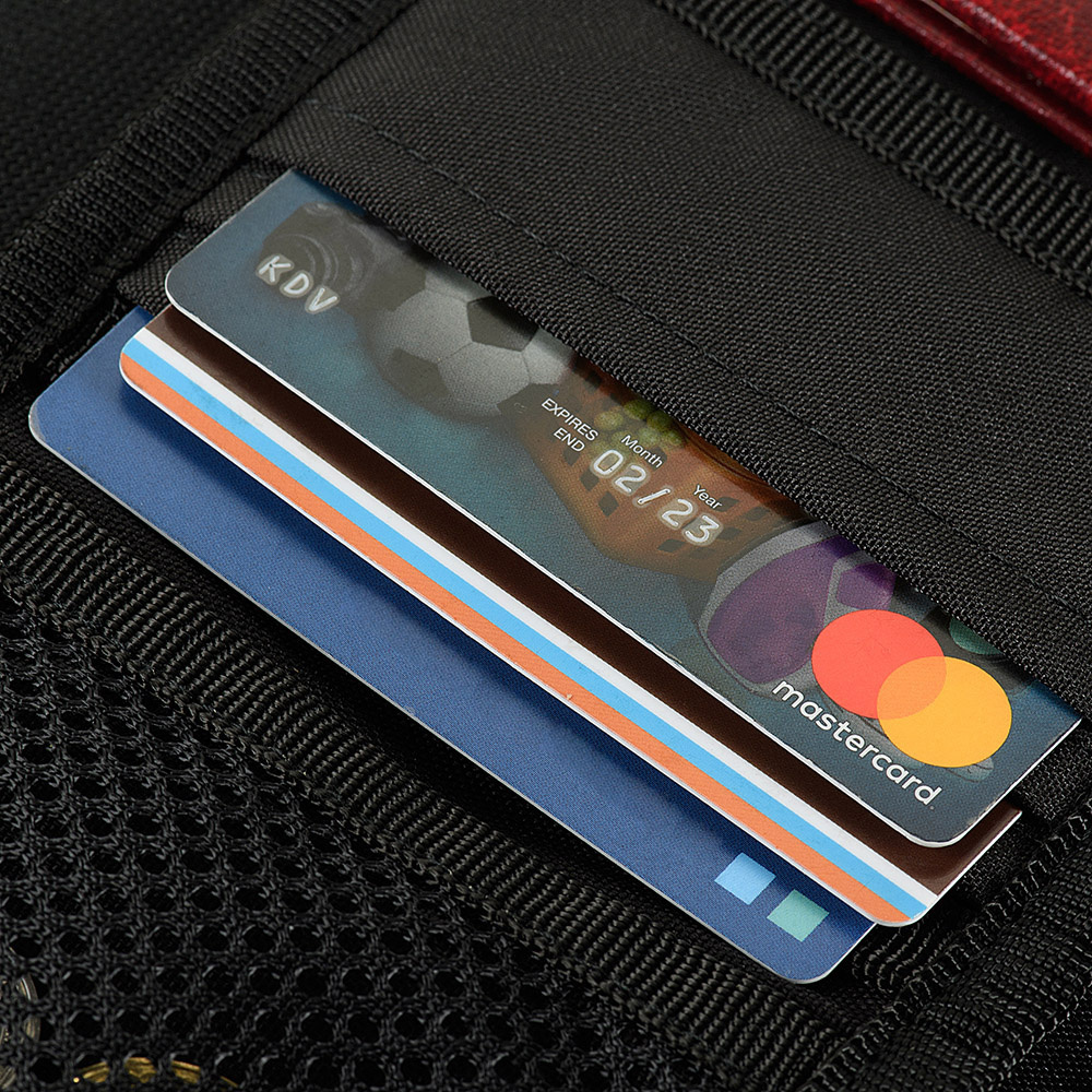 Гаманець має два великих відділення для купюр, відділення для карток і кишеню з віконцем для документа, що посвідчує особу. Вікно виготовлене з ПВХ-плівки, яка захищає вміст від ультрафіолетового випромінювання. Творці також подбали про наявність кишені для монет, що закривається на знамениту блискавку YKK.