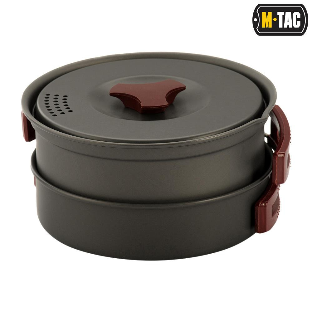 Набір M-Tac включає 2 корисні страви: каструлю та сковорідку та набір із 6 аксесуарів, а саме: кришку, 2 чашки, лопатку, черпак та губку. Такий широкий асортимент продуктів дає змогу користувачеві готувати їжу, перебуваючи на лоні природи, або на багатті, або за допомогою туристична плита.