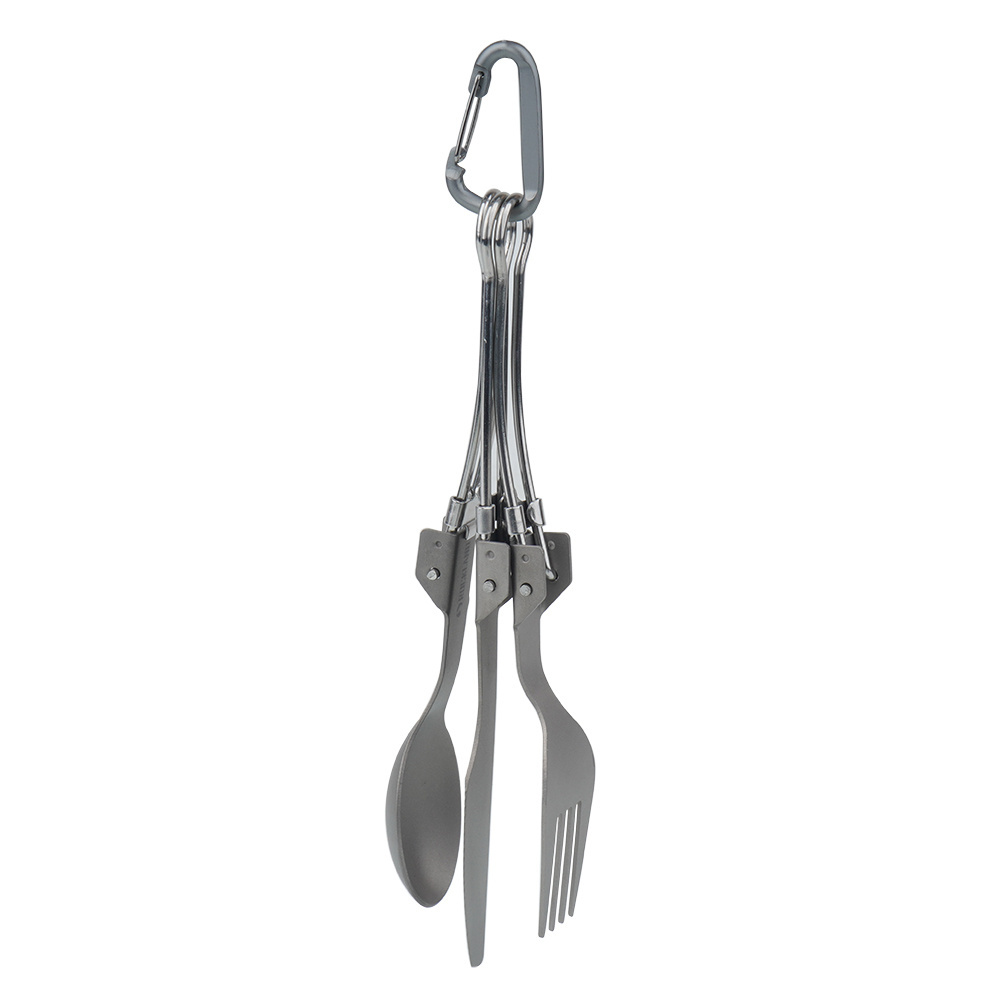 Складний похіднийнабір столових приборів від Rockland. Надлегкий туристичний набір з титану включає в себе складну ложку, виделку та ніж, які можна з'єднати разом завдяки карабіну і компактно носити в туристичному рюкзаку.