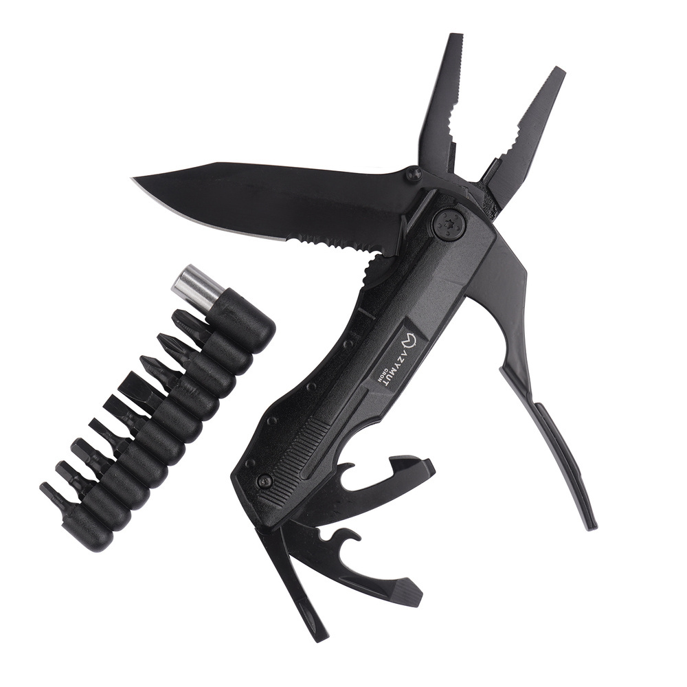 Плоскогубці з плоским кінцем Плоскогубці з зубцями Кусачки Ніж з гладким і зубчастим лезом Відкривачка для консервів Вузька шліцьова викрутка Відкривачка для пляшок Широка шліцьова викрутка Магнітний адаптер для насадок Ключ-перехідник для біт Біти - 9 типів (3 плоскі, 3 хрестоподібні та 3 шестигранні) |