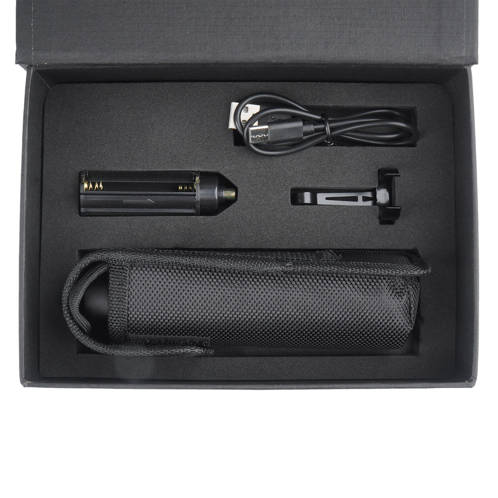 Ліхтар упакований у стильну подарункову коробку, що закривається на магніт. Всередині вона вистелена пінопластом з вирізом для компонентів набору. У комплекті з ліхтарем йде металевий затискач для ременя, зарядний пристрій USB-C, ремінець для зап'ястя і чохол на липучці з петлею для ременя максимальною шириною до 65 мм.