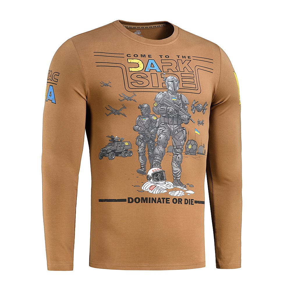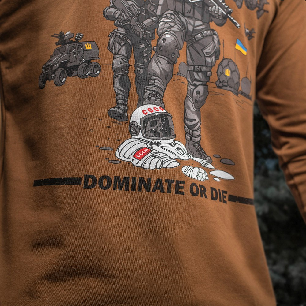 На світшоті зображений англомовний принт. Вгорі напис "Come to the dark side", а внизу напис "Dominate or die" з оригінальним зображенням українських космонавтів зі зброєю в руках.