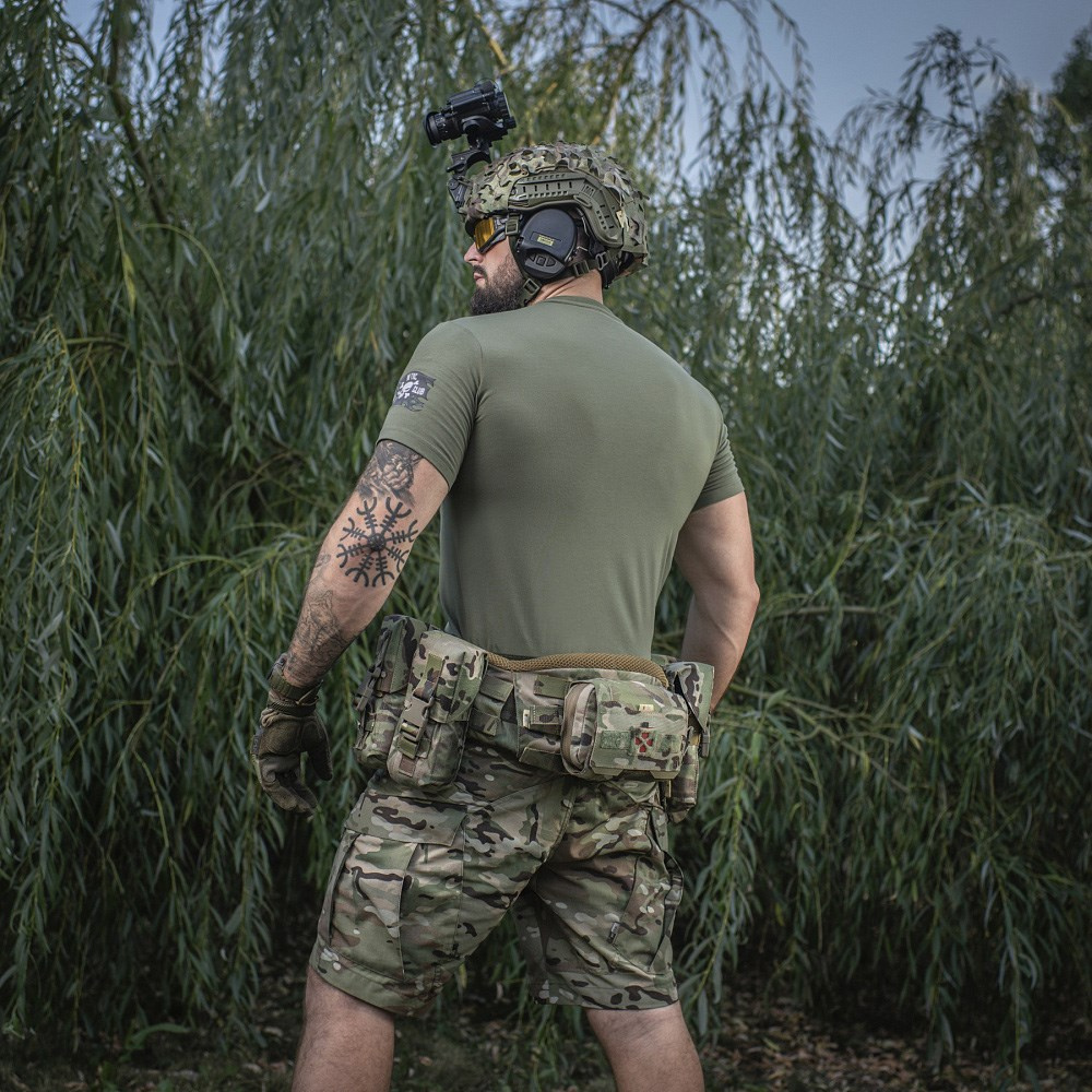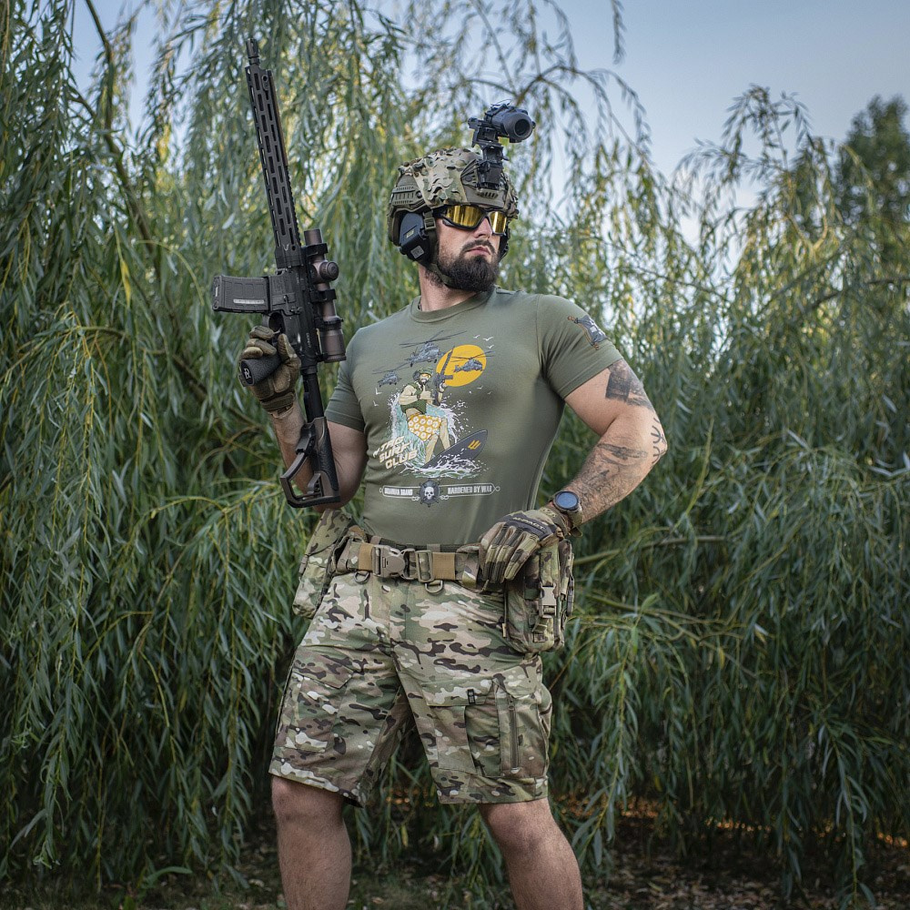 Футболка була розроблена з думкою про комфорт та стиль. Вона має класичний приталений крій та короткі рукави. На грудях - яскрава графіка, натхненна фільмом "Апокаліпсис сьогодні", із зображенням хвиль, дошки для серфінгу та стилізованого офіцера спецназу. У свою чергу, на лівому рукаві - принт із зображенням прапора "Веселого Роджера". Футболка чудово підійде для повсякденного використання, особливо в парі з тактичними штанами або світшотом в стилі мілітарі.