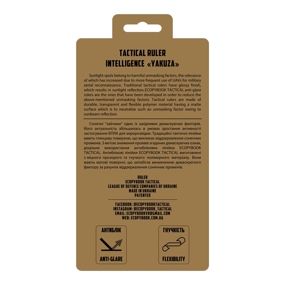 Блокнот Ruler Tactical Ecopybook від M-Tac виготовлений з гнучкого та прозорого полімеру. Вона знайде своє застосування під час розробки польових карт. Відрізняється від традиційних лінійок тим, що створена з матового матеріалу, який запобігає відблискам. Таке рішення полегшує приховування її положення і тим самим підвищує безпеку користувача.