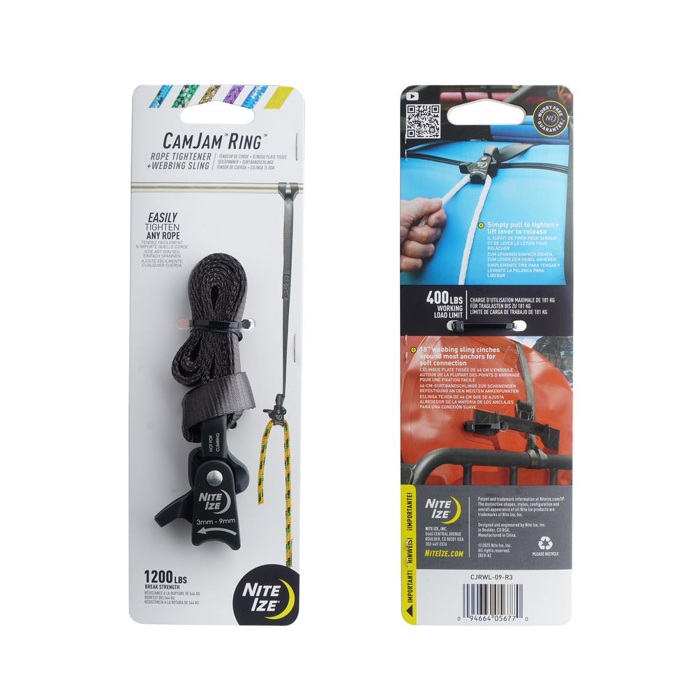 Практичний затяжка для мотузки CamJam™ у варіанті Ring™ від Nite Ize. Пристрій складається з двох компонентів - пряжки та ремінця. Пряжка використовується для затягування, зачеплення або закріплення мотузки, зокрема, типу паракорд діаметром від 3 до 9 мм, а ремінець - для закріплення навколо обраного об'єкта окружністю близько 40 см. Таке рішення дозволяє швидко, надійно знерухомити даний багаж, спорядження, банери, брезенти, а також намети.