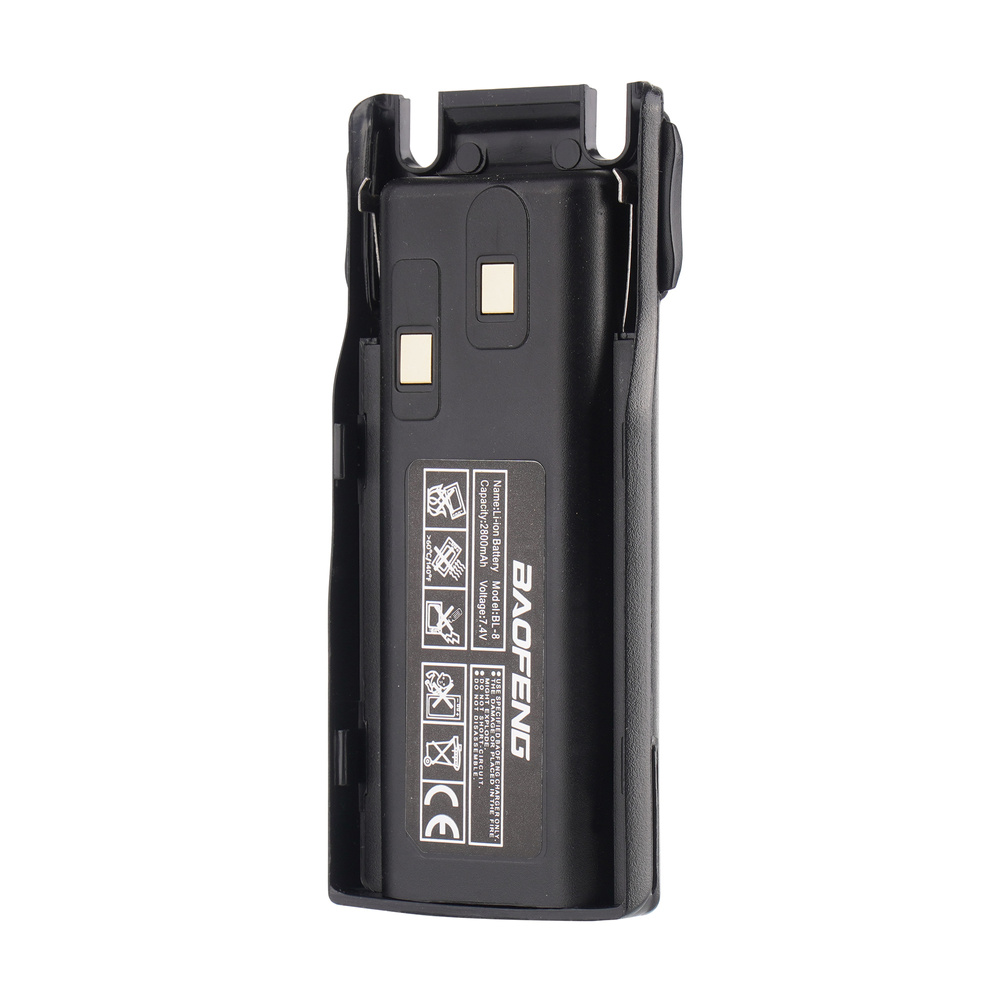 Змінна акумуляторна батарея для радіостанції BaoFeng UV-82, з серією літій-іонних елементів, укладених в жорсткий полімерний корпус, загальною ємністю 2800 мАг (20 Втч) і постійною напругою 7,4 В. Акумулятор має зовнішні клеми для підключення до зарядних станцій, а також порт USB-C для зарядки за допомогою сумісного кабелю. На зовнішній стороні є ребра, які допомагають міцно тримати радіостанцію в руці.